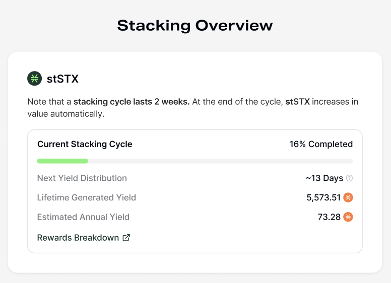 一旦 Stacks 交易确认，用户还可以访问 “Stacking Overview”（质押概览），该页面提供关于他们所使用的 Stacking DAO 服务的最新质押周期数据。