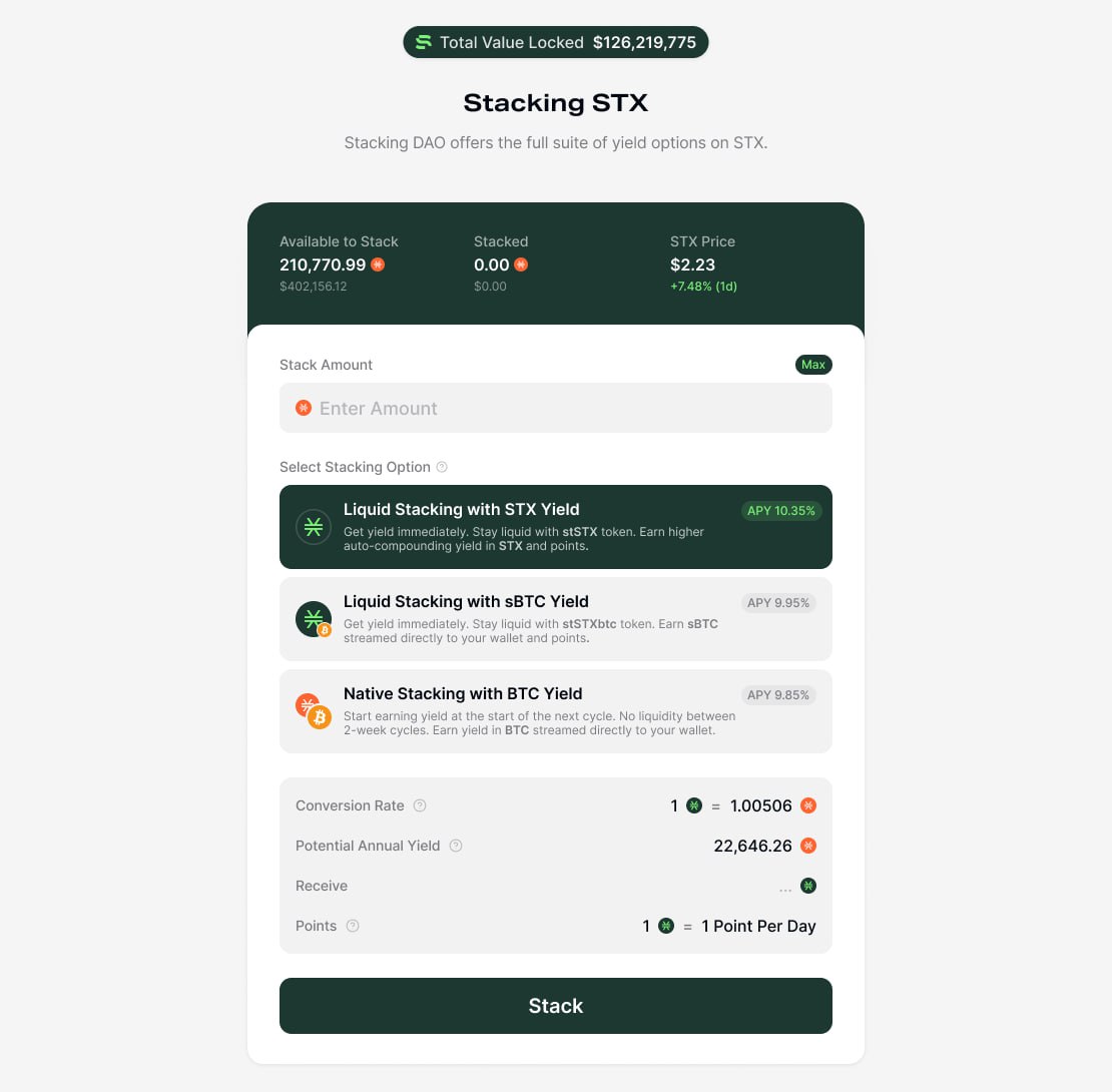 一[旦连接了钱包，用户将可以选择](https://app.stackingdao.com/) Liquid Stacking（流动性质押）以获得 STX 收益、BTC 收益或原生质押的选项。