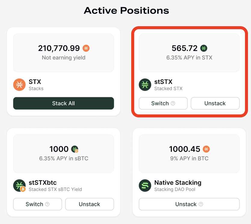 当滚动到质押部分时，你将能够在 “**Active Positions”**（活跃仓位）中查看你的具体 stSTX 位置。在这里，你还可以通过点击 “Switch” 按钮切换到 stSTXbtc 代币。
