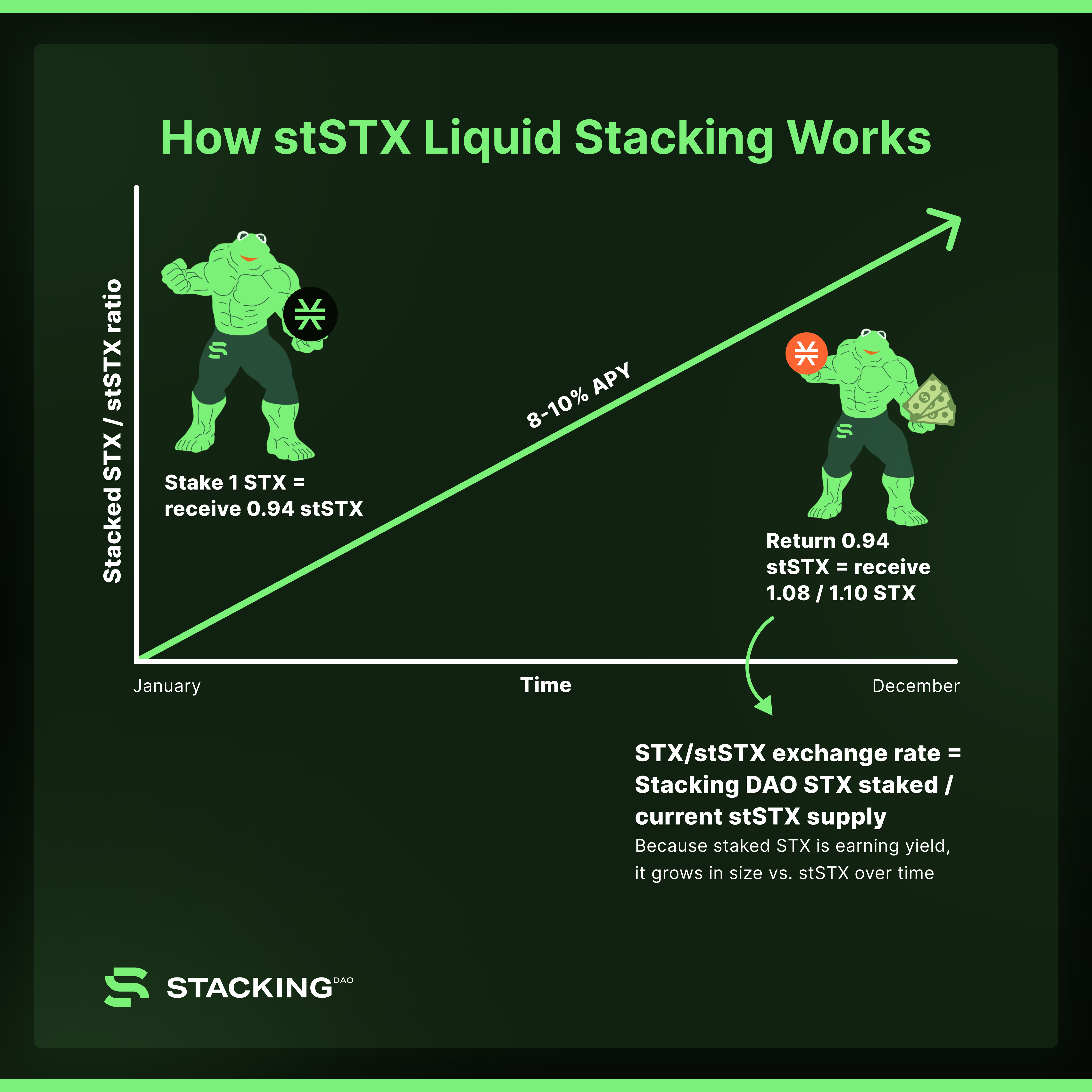 <figure><img src="https://content.gitbook.com/content/N0aP9nOrtuHVN5ytrnrp/blobs/V2cTZEErVJkKhNKAncjh/Graphic-1.png" alt="" width="563"><figcaption><p>Example assuming STX/stSTX ratio starts at 0.94. The ratio changes as Stacked STX grows respect to stSTX.</p></figcaption></figure>
