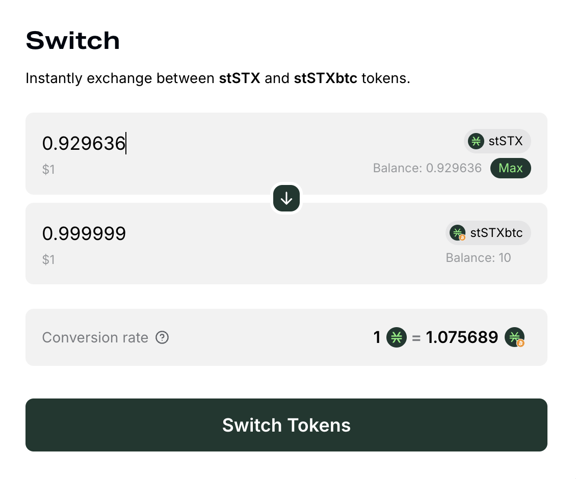 然后会出现一个切换部分，用户可以选择将多少 stSTX 切换为 stSTXbtc。