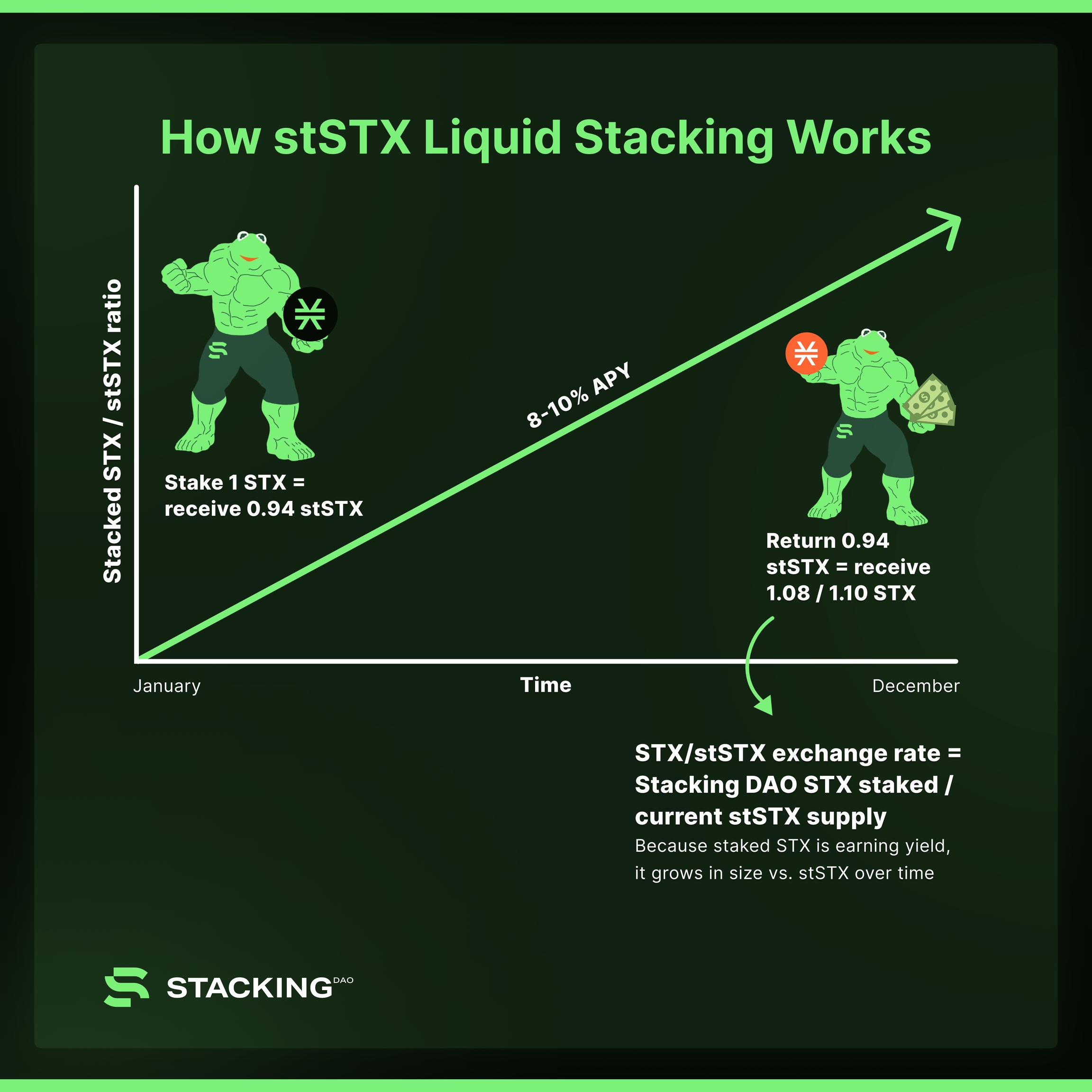 由于 Nakamoto 升级,交易通常会在几秒钟内成功确认,你将根据显示的比例在钱包中收到 stSTX 代币。