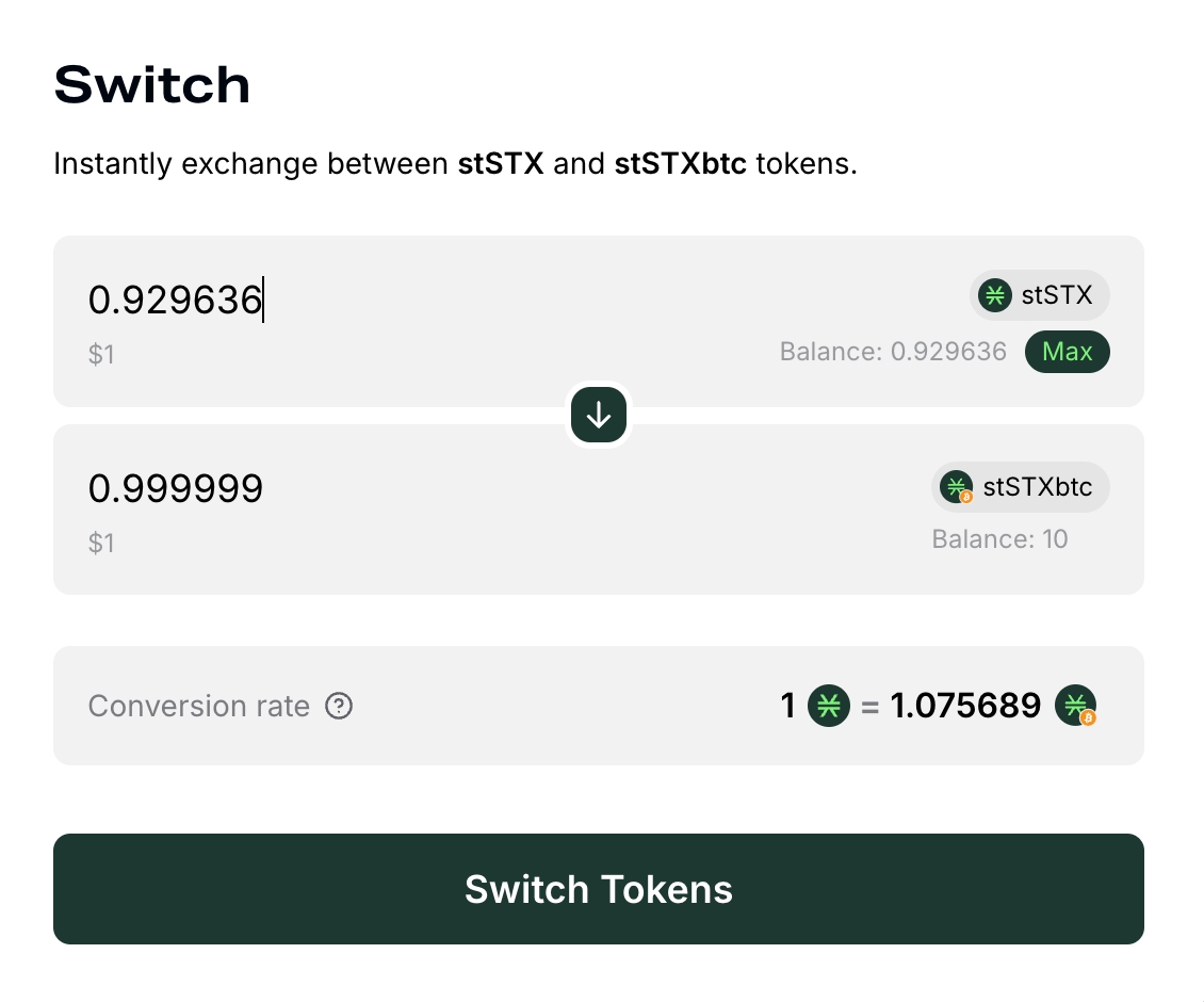然后会出现一个切换部分,用户可以选择将多少 stSTX 切换为 stSTXbtc。