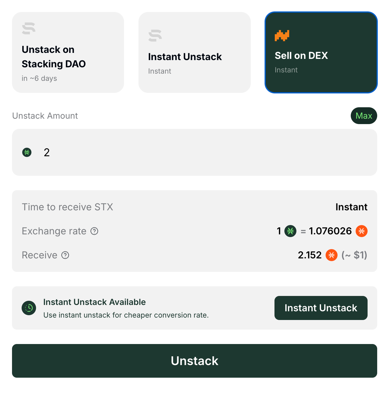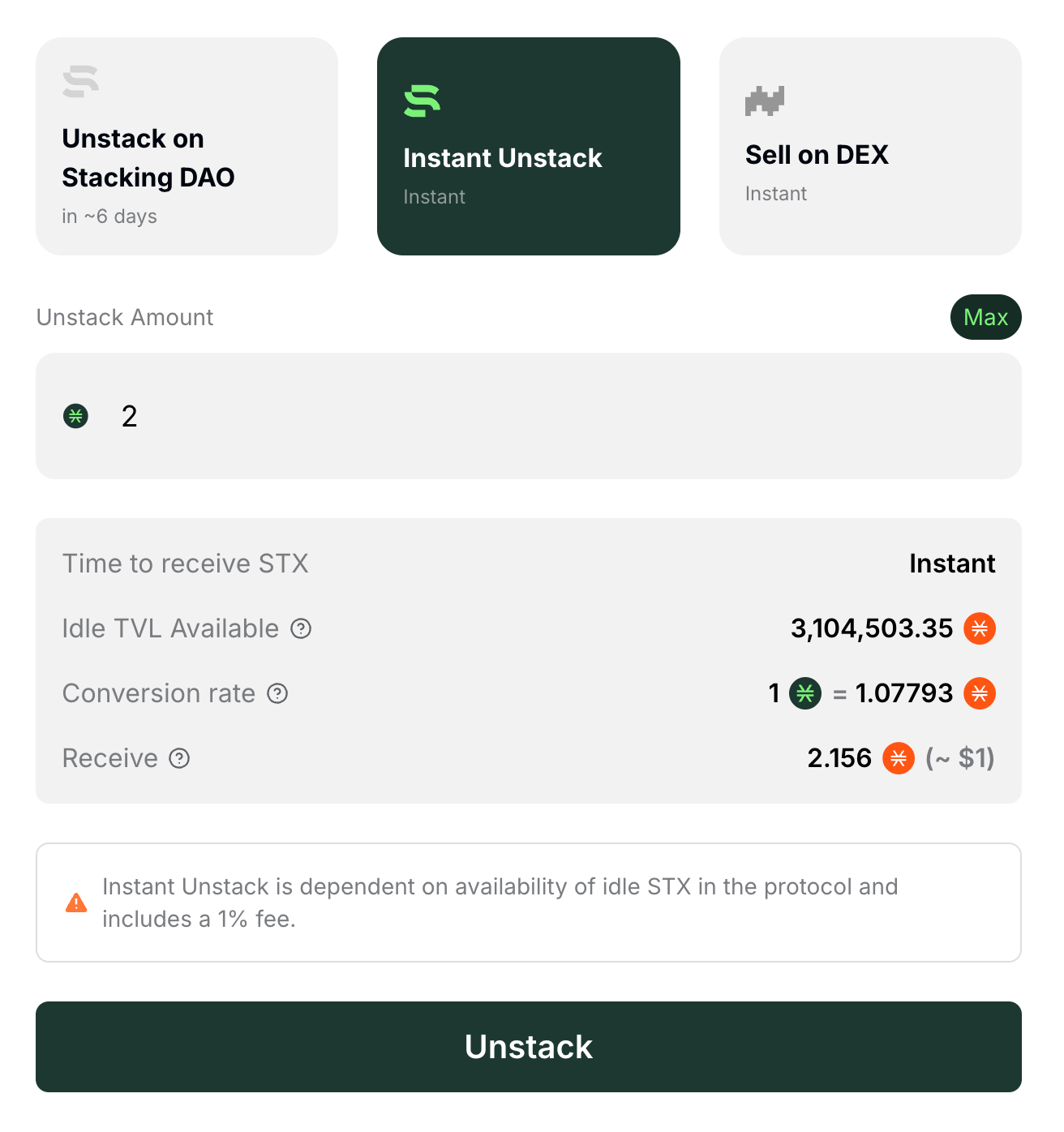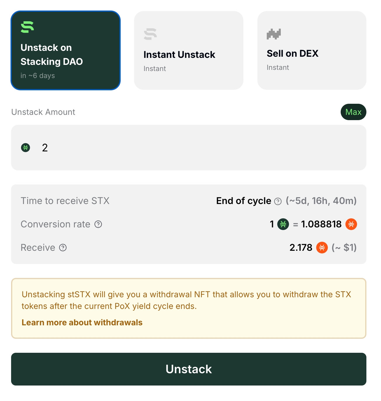 请注意,由于 DEX 附带额外费用,此选项的 stSTX 到 STX 的转换率可能会低于 Stacking DAO 选项。