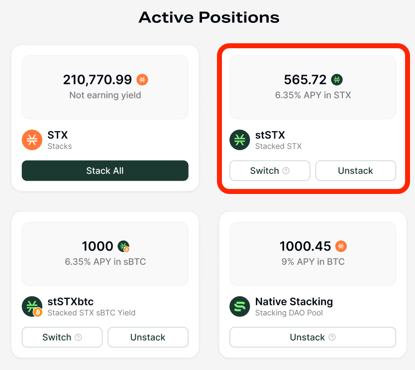转到 “Stacking” 部分,找到 “Active Positions” 下的 stSTX 卡片。