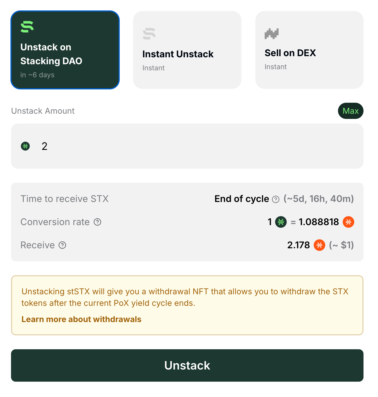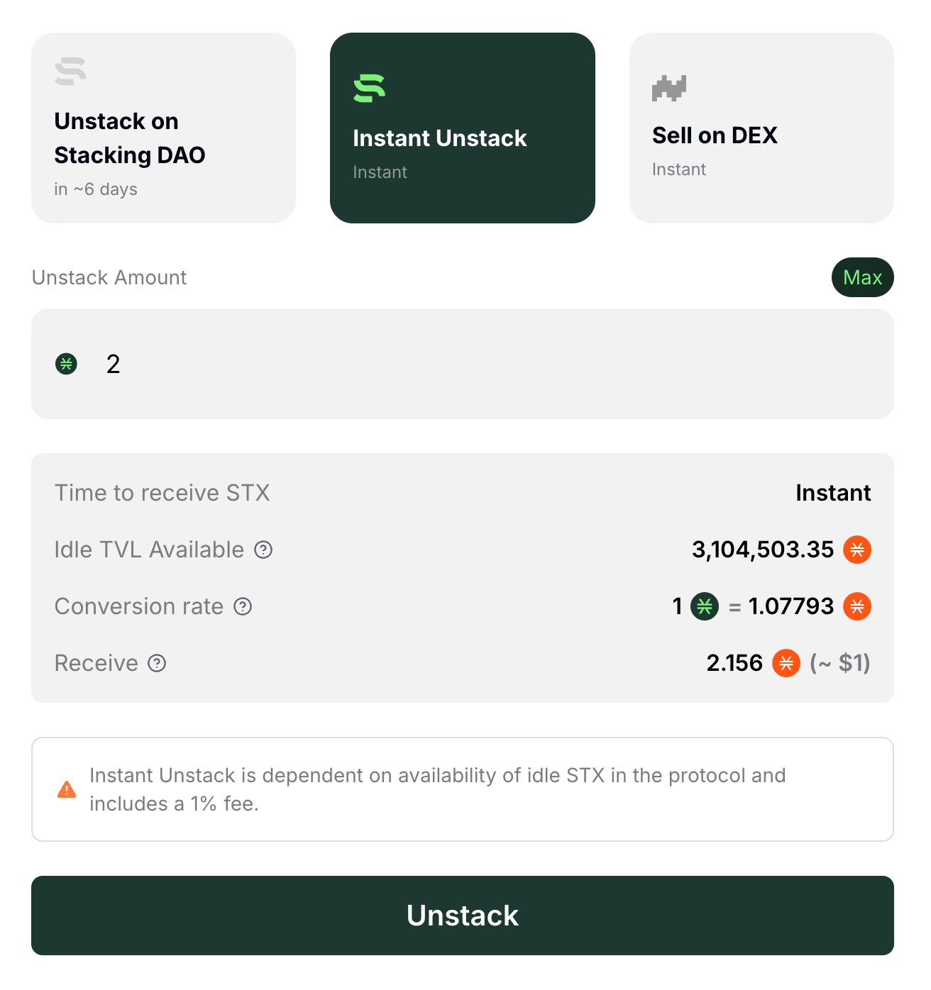 为了进行解锁,选择 “Instant Unstack” 选项,选择要提取的金额,然后点击 UI 中的 “Unstack” 按钮。