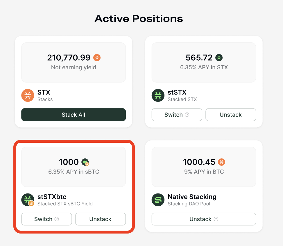 1. 进入 Stacking 页面，在「**Active Positions（活跃头寸）**」中找到 stSTXbtc 卡片；