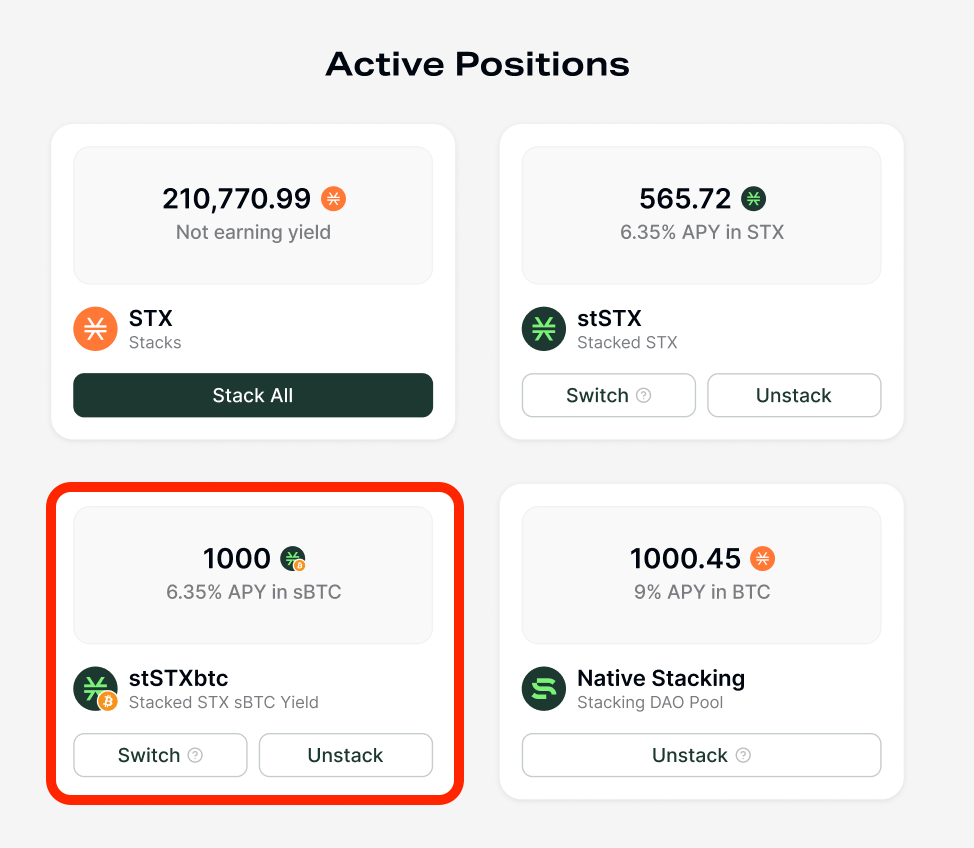 进入 Stacking 页面,在「Active Positions(活跃头寸)」中找到 stSTXbtc 卡片;