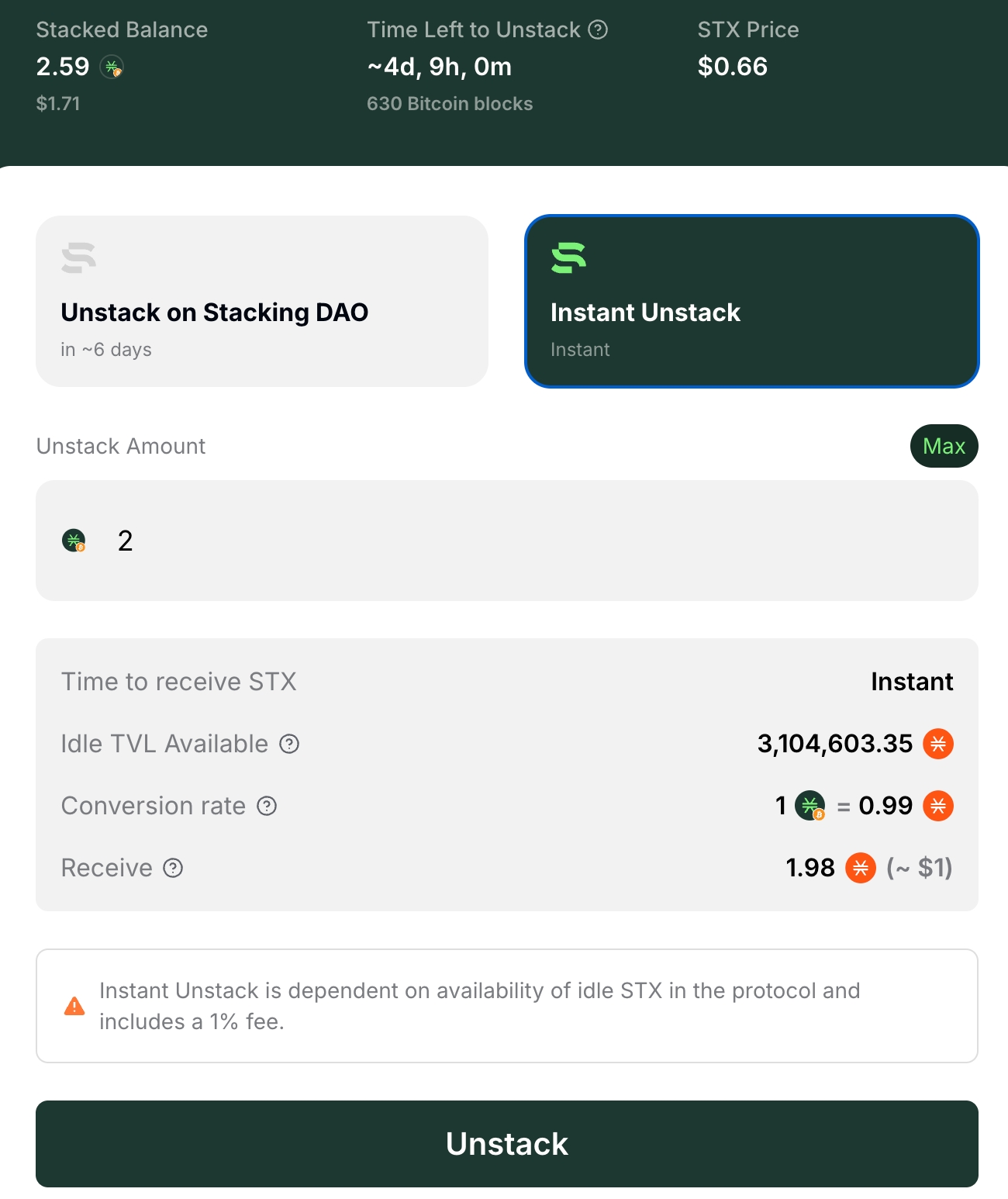 In order to unstack, simply select the "Instant Unstacks" option, choose the amount to withdraw, and click the "Unstack" button in the UI: