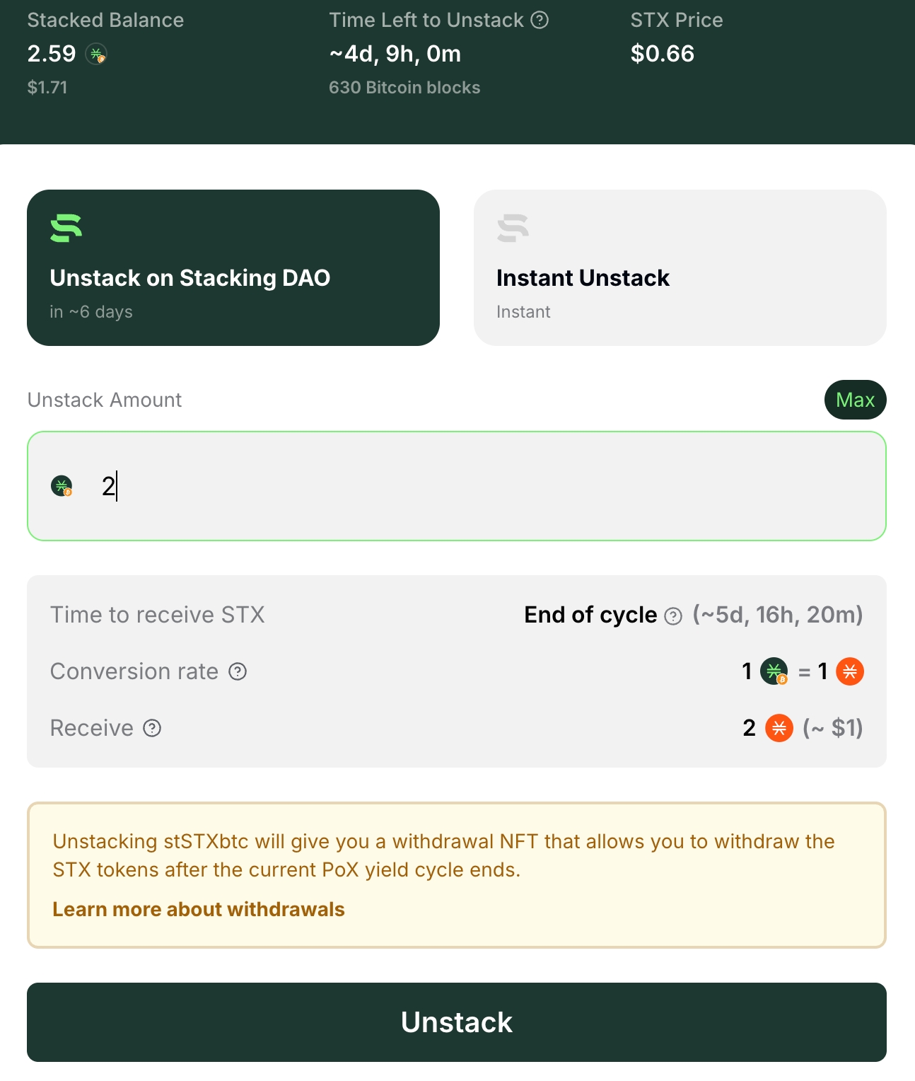 This will bring you to the "Unstack stSTXbtc" section, which presents users with the option to withdraw STX.